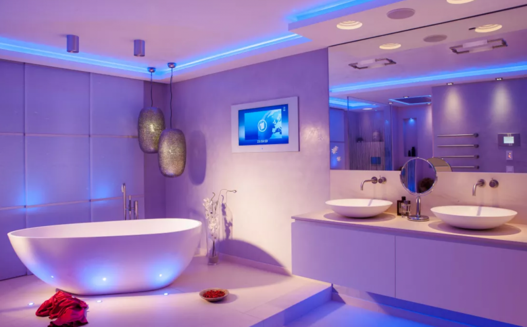 Для подсветки ванной комнаты следует использовать светодиодную продукцию с наивысшей степенью защиты от влаги и пыли, чтобы обеспечить бесперебойную работу светодиодных приборов. Для герметичной светодиодной ленты идеально подойдёт алюминиевый защитный профиль вместе с рассеивателем и заглушками. Блоки питания следует герметичные (IP 67), на крайний случай — сетевые (IP44). Готовые комплекты подсветки на базе герметичной светодиодной ленты облегчат монтаж и установку осветительных приборов и позволят установить подсветку за несколько минут.