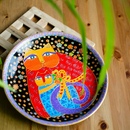 Когда контуры высохнуть, яркими красками закрашиваем свободные части. Даем окончательно просохнуть тарелке и крепим ее на стену. Вот и все.