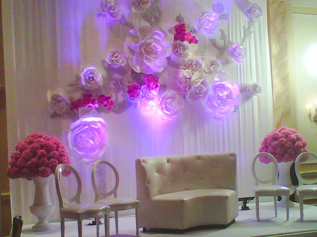 - Если использовать для украшения стены цветы из перламутровой бумаги, то такая композиция будет переливаться волшебными искорками, которые создадут загадочную атмосферу свадьбы.