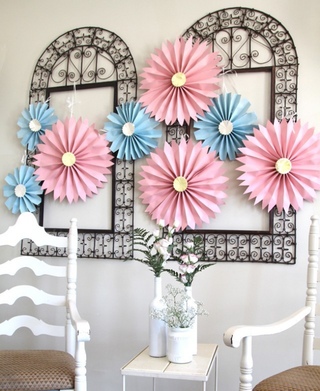 После того как украшения будут готовы, приступайте к оформлению стены. Для декора вам понадобится около 20 бумажных цветков. Комбинация нескольких оттенков в одной цветовой гамме поможет достичь оригинального оформления вашей свадьбы. Чтобы получить оригинальную композицию, рекомендуем использовать цветы разных размеров и форм. Важно избежать неприятных моментов на свадьбе, а для этого обязательно уделите внимание надежному креплению всей конструкции.