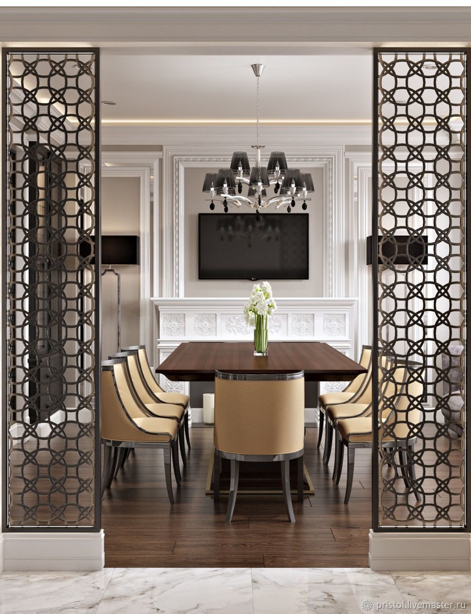 Сюда же можно отнести и лепнину. Например, вокруг арки разместить имитацию колонн, а сам проход задекорировать фигурными элементами по прототипу античных храмов и дворцов с каннелюрами. Лепнина наиболее уместна в классическом дизайне интерьера.