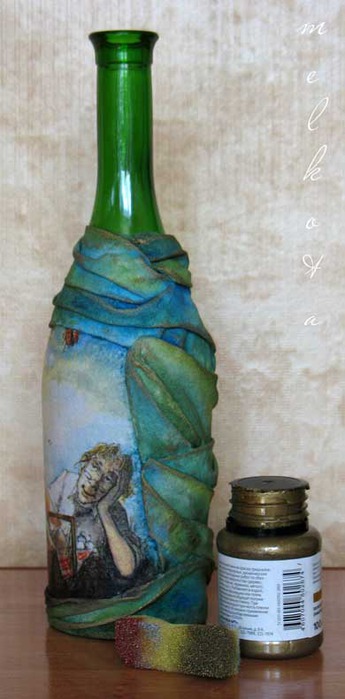 Но, если тебе наплевать, ты не научишься рисовать, не отчаивайся. Вы можете использовать технику. Его суть в том, что фрагменты уже нарисованных фрагментов рисунков берутся и приклеиваются к предмету, который вы хотите украсить. Можно использовать трехслойные салфетки, которые снимают верхний красочный слой и аккуратно приклеивают на флакон с помощью клея ПВА, разбавленного водой в соотношении один к одному.Обычной губкой прижимаем салфетку к бутылке и наблюдаем за складками и пузырями. Когда салфетка высохнет, накройте флакон акриловым лаком. Можно прорисовать какие-то детали, например, раскрасить горлышко бутылки или нанести на дно полосы с кисточкой.
