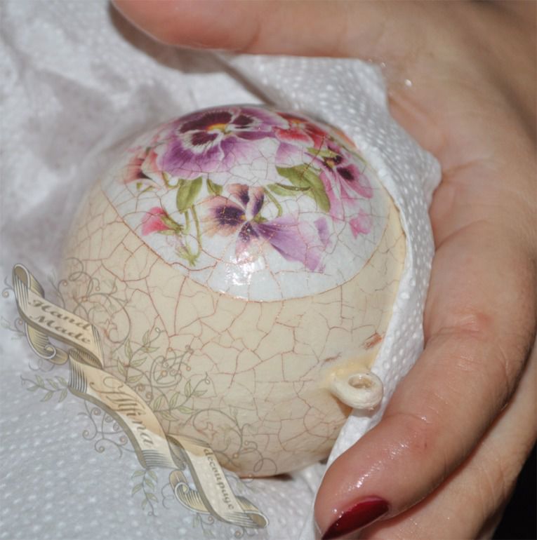 Для этого вам потребуются: пластиковый шар, состоящий их двух частей, бумажная салфетка с красивым рисунком, немного клея для декупажа, чуть-чуть средства для создания трещин, несколько цветов акриловых красок, кисточка и ножницы. Вначале разделите шар на две половинки и нанесите на внутреннюю сторону клей для декупажа. Затем возьмите вырезанный с салфетки фрагмент рисунка, приложить его лицевой стороной на слой клея и расправьте кисточкой, которая смочена в клее. Делать это нужно быстро и аккуратно, чтобы бумага не порвалась. Если на салфетке образуются складки, не пугайтесь, когда вы соберете шар, они не будут заметны. Когда клей подсохнет, нанесите поверх него тонким слоем специальное средство для создания трещин и дайте ему полностью высохнуть.