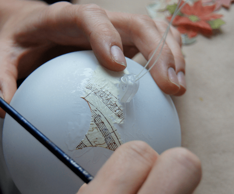 4. Разведите клей ПВА наполовину водой и приклейте мотивы на шарики. Начинайте приклеивать с середины мотива и постепенно продвигайтесь к краю.