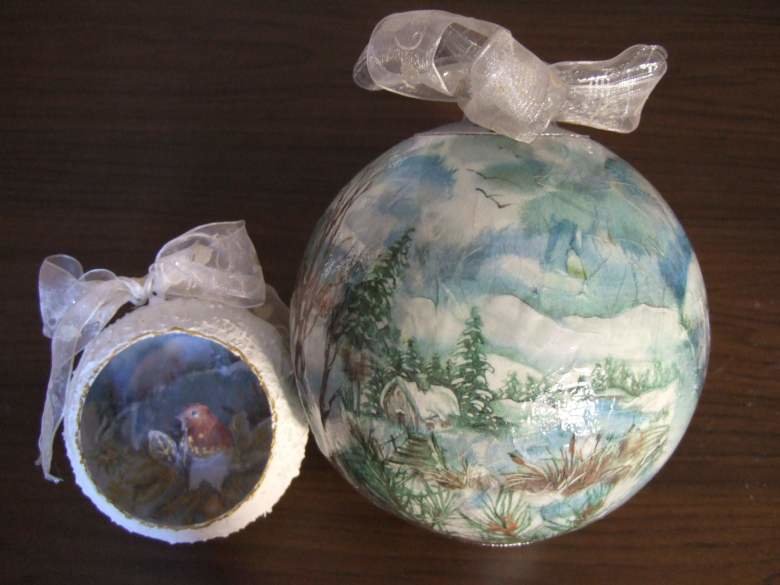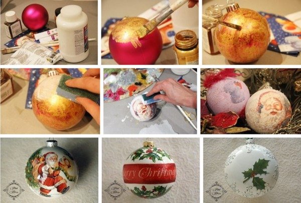 Декупаж новогодних шаров (мастер класс поможет подобрать наиболее подходящую для вас технику) применяют также для того, чтобы искусственно состарить елочные украшения.
