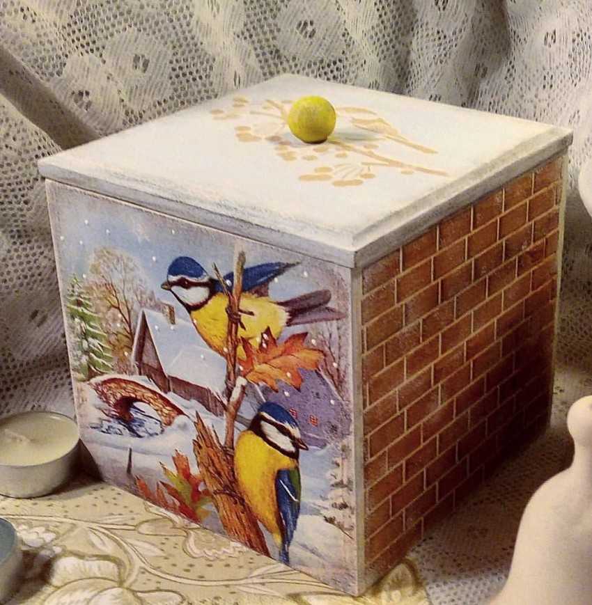 Разнообразные емкости для хранения сыпучих продуктов стоят достаточно дорого, но вы можете сделать красивую коробку для печенья, конфет или чая своими руками с помощью декупажа. Не зря декупаж называют салфеточной техникой, ведь для такого способа оформления изделий необходимы красивые салфетки, декупажные карты или напечатанные на листе бумаги картинки.