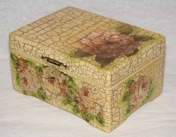 После того, как грунтовка хорошо высохнет, наносим несколько слоев краски. Для эффекта дополнительного растрескивания используется кракелюрный лак. Его наносят, затем, пока он не высох, красят акрилом белого цвета. После просыхания акрила клеим мотив (если не используем кракелюр) и покрываем бесцветным лаком. Можно лакировать с помощью лака-спрея. Так нанесение будет более ровным.