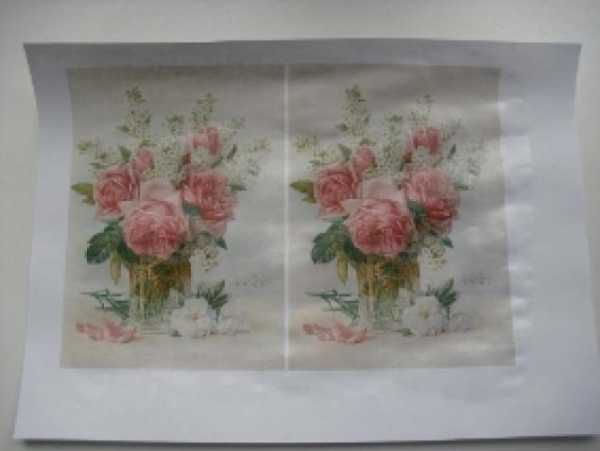 Для декупажа можно использовать открытки, которые предварительно замачиваются в воде, после чего снимается верхний слой, так как рисунок должен имитировать роспись