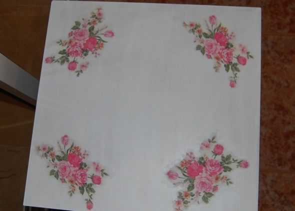 Довольно часто в качестве изображения используют столовые салфетки, которые обычно бывают многослойными. Понадобится только верхний слой с рисунком. Поверхность основания обязательно должна быть светлой. При нанесении лака салфетка становится более прозрачной, и на темном фоне рисунок утратит свою контрастность.
