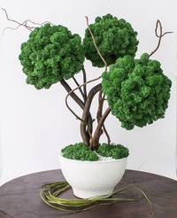 Стабилизированный мох собирают в лесах, максимально достают всю влагу, мусор и живность. Затем вымачивают в специальном растворе (процесс называется стабилизацией). По сути происходит консервация. В результате появляются новые полезные свойства: устотйчивость к гниению, плесени и размножению бактерий. Получившийся материал не требует ухода, полива и дополнительного освещения. Только опрыскивание примерно раз в месяц водой из пульверизатора. Идеально подходит для флористики и интерьерного декора.