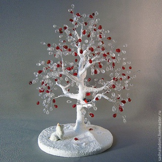 Эту елочку достаточно просто сделать. Конус из пенопласта необходимо покрасить красной краской. Для декорирования используются искусственные яблоки. Их приклеивают к конусу прозрачным клеем либо клевым пистолетом. Для украшения основания корпуса используются ветки, которые рекомендуется смастерить из красного бисера. Макушка такой елки украшается звездой или бантиком.
