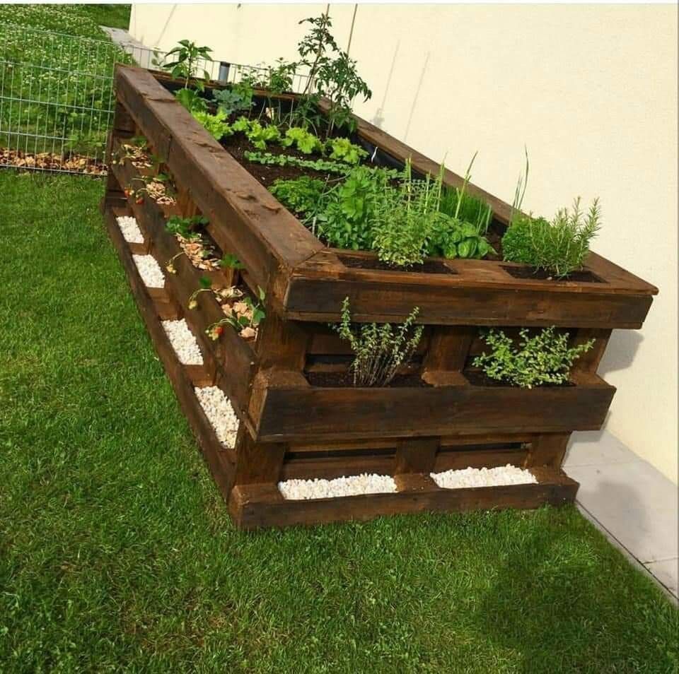 Вы бы поверили, что этот конкретный сад был сделан из деревянных поддонов? Вы можете оживить древесину, покрыв ее красивой морилкой, и расположить ее в виде пирамиды, чтобы получилась по-настоящему элегантная кровать. Такой цветник украсит любой дом.