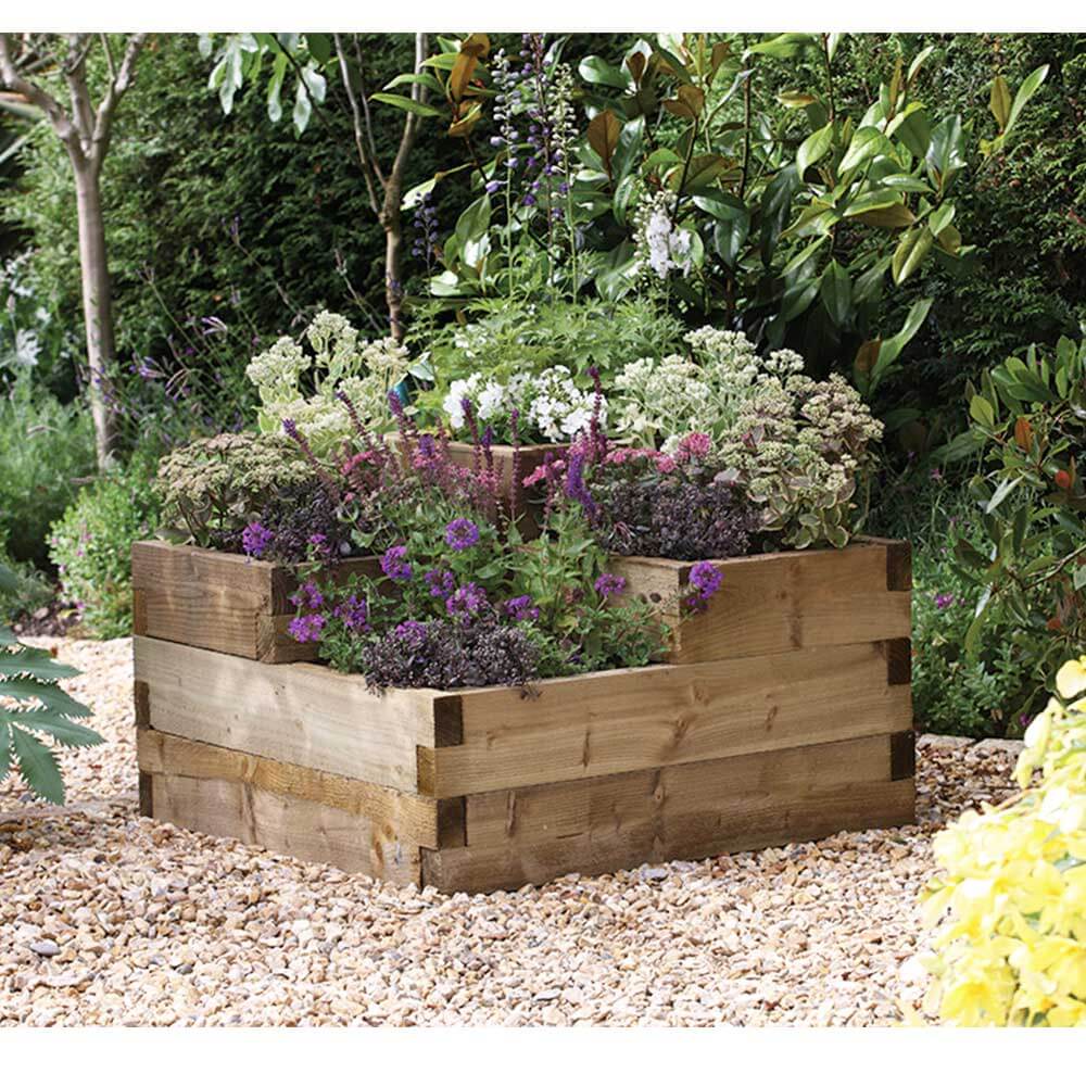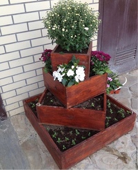 - Многоуровневая клумба готова, теперь ее нужно собрать и засыпать грунтом, высадить красивые цветы. Такая конструкция просматривается с каждой стороны.