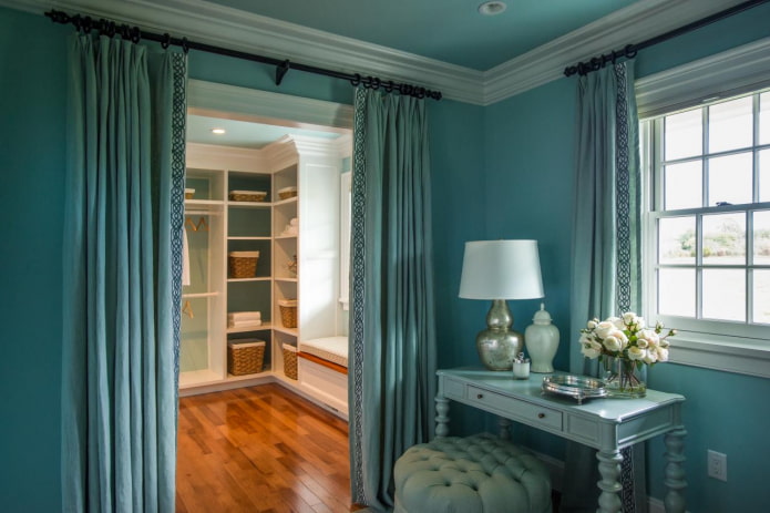 На фото бирюзовая занавеска на люверсах на дверном проеме, ведущим в спальню.