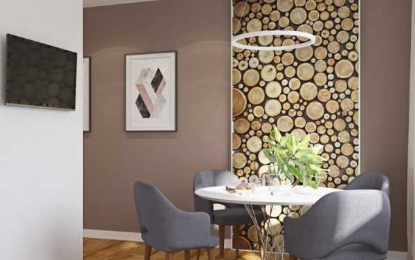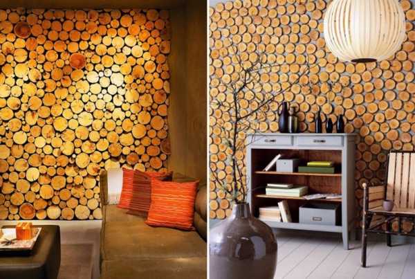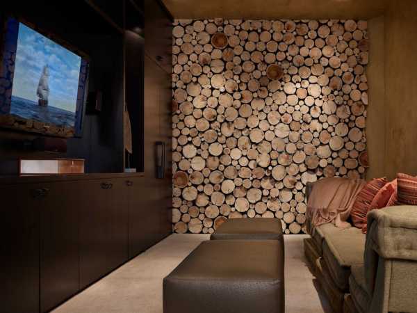На фото стена из спилов в гостиной. Натуральное дерево способствует расслаблению, кроме того приятно пахнет и долго хранит аромат эфирных масел.