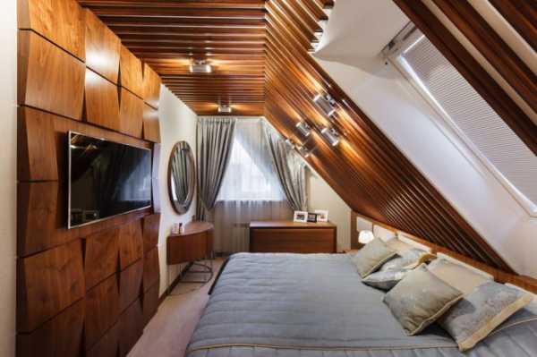 Более экономичный вариант отделки использование вагонки и ламината. Панели могут покрывать все или одну стену, использоваться как декоративные вставки у подоконников, телевизора, кровати.