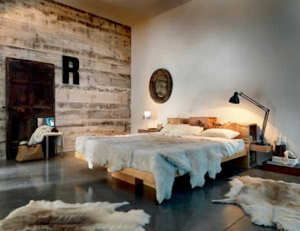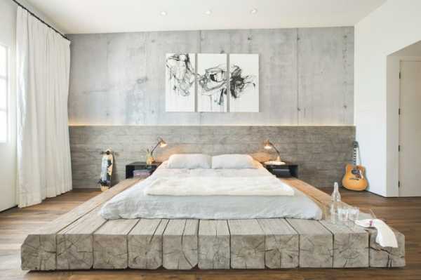 На фото простой матрац на поддонах и изголовье из спилов смотрится необычно в современной квартире. Такая простота сочетается с экологичностью и стилем одновременно.