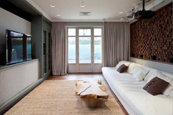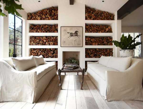 Пни и крупные спилы в интерьере гостиной могут играть роль журнального столика и стать главным предметом внимания гостей. Из спилов и гальки можно сделать акцентную стену у телевизора, из обработанных палок и веток – карниз, светильник и другие аксессуары.