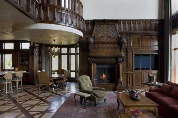 На фото интерьер гостиной в классическом стиле, для отделки подойдут деревянные панели с резьбой и паркет с небольшим ковром.