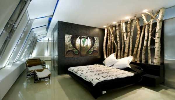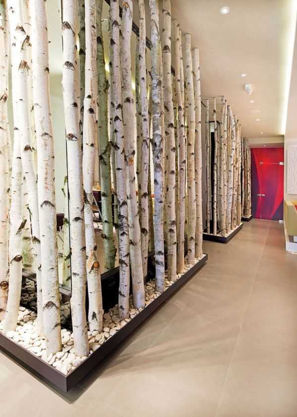 Сочетание эко стиля и хай-тек порождает притягательную эклектику. На фото стволы березы служат эффектным акцентом. Важно помнить, что натуральную древесину стоит обрабатывать маслами и лаком во избежание появления плесени