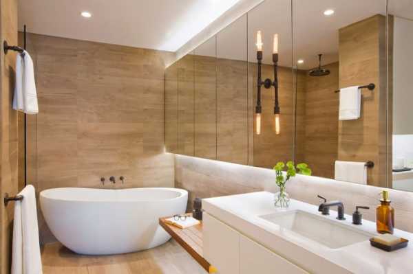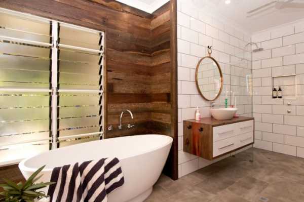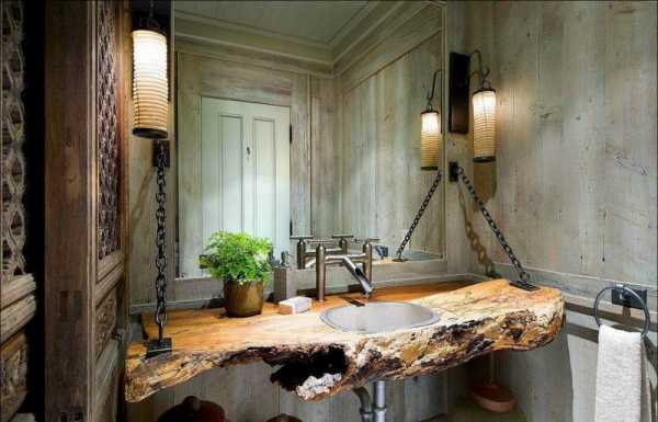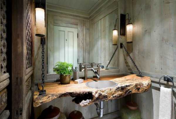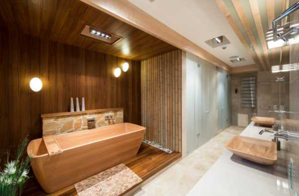Дерево в интерьере ванной создает ощущение сауны или русской бани. Деревянные стены и каменный пол, или наоборот, создают уникальный дизайн. Для отделки ванной нужно подбирать устойчивые к влаге породы (бразильский орех или бамбук, как на фото ниже).