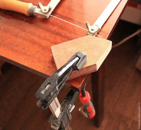 - Зажимаем брусок в струбцине и отпиливаем по линиям.