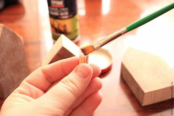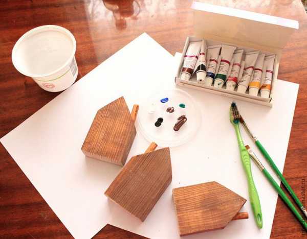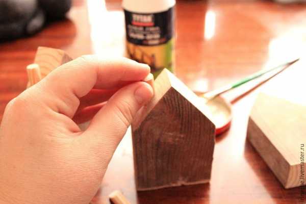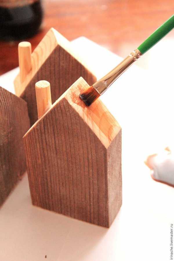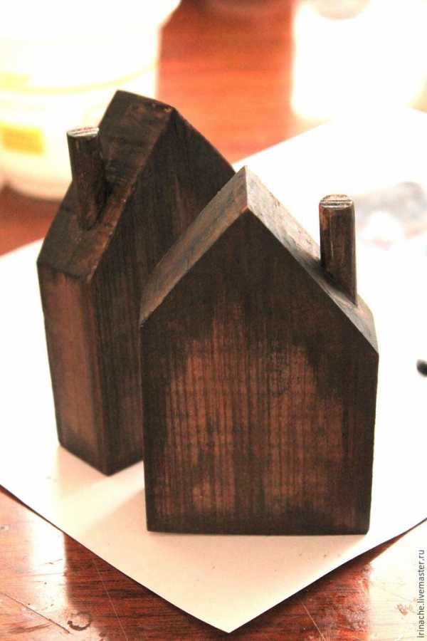 - Тонируем домики акриловой краской, довольно сильно разведенной водой. Краска не должна сильно покрывать домик, нам нужен оттенок, тонировка, чтоб просвечивалась структура дерева. Затем чуть сильнее затемняем углы домика и крышу, делая плавные переходы, размывая границы.