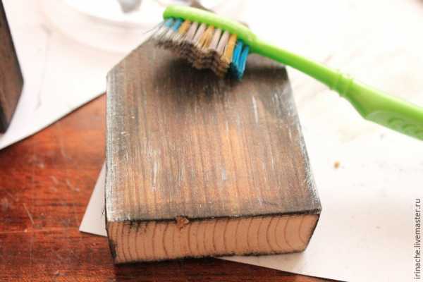 - Берем жесткую кисть (я применяла старую зубную щетку), набираем белой краски и вытираем ее об тряпку, слегка проходимся кистью по углам и стенам домика. Крышу и трубу красим более плотным слоем, можно с легким оттенком (бордо, коричневый, синий, черный).