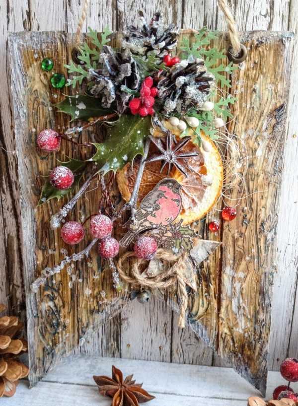 Новогодний декор из дерева в интерьереДоски для продуктов могут украшать стены кухни, если на них нанести соответствующий обстановке рисунок.