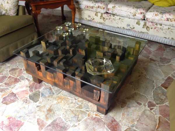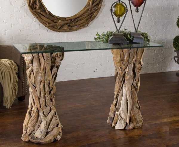 Обратите внимание хотя бы на этот столик, стеклянная столешница которого установлена на основании, сделанном из старых виноградных лоз. Эта простая и очень красивая идея для того, чтобы использовать декор из дерева в интерьере, подойдет дизайну в стиле эко, эклектика. Легко представить себе и другую столешницу на этих же «ножках».