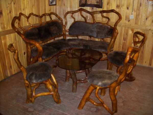 Основание столика из затвердевшей лозы — прекрасный вариант декора из дерева в интерьереКресло-качалка, сбитое из немного корявых ветвей дерева, превосходно будет смотреться в загородном доме, оформленном в стиле кантри. Такой предмет мебели со своей особенной историей привнесет свой колорит в подобное помещение.