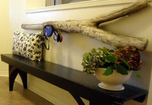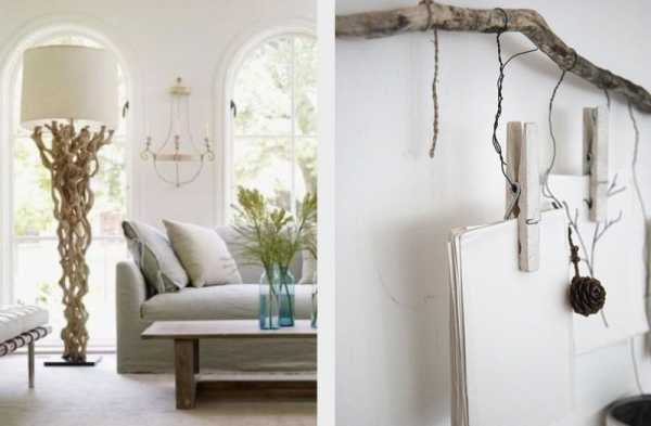 Из ветвей получаются интересные образцы деревянного декора в интерьереИз больших ветвей можно сделать балки, уместные в деревенской стилистике, рустикальном стиле и провансе.