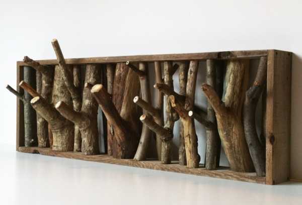 Балки как декор из дерева в интерьереИз мелких веточек хорошо изготовить вешалки, разнообразные полочки, крючки. Такой деревянный декор в интерьере всегда притягивает взгляд и вызывает интерес.