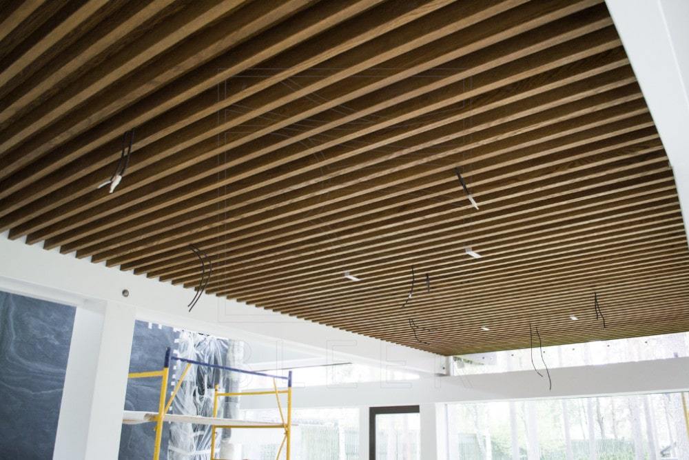 виды, различия, потолочная деревянная рейка, реечный потолок из дерева