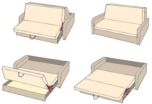 - «Аккордеон» . Используется аккордеонный механизм. . Спальное место раскладывается из трех частей, сиденье — одна часть, спинка — две другие части. Для срабатывания механизма поднять сиденье, толкнуть вперед, спинка ставится в одной плоскости. Двуспальная кровать утром убирается, комната снова становится просторной.