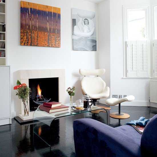 - Минимализм – центральным звеном в помещении отводится мягкой мебели с резкими геометрическими формами. Прямоугольный фиолетовый диван, жесткие пуфы с однотонной отделкой или с использованием броского графического орнамента на фоне белых стен подчеркнут креативность минималистического стиля. При составлении дизайна гостиной, особой популярностью пользуется мебель-трансформер. Это – журнальный столик, встроенный в угловой диван, декоративные ниши и полочки.
