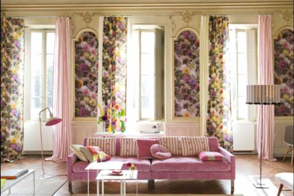Например, повторить цветочный мотив обивки дивана в обоях. Желательно при этом наличие в комнате однотонных элементов: стены\пол\мебель. Однако же, цветочный мотив, полностью воплощенный во всех элементах интерьера, тоже вполне жизнеспособный вариант оформления, как на рисунке ниже, в комнате, которую можно было бы назвать «ботаническая».