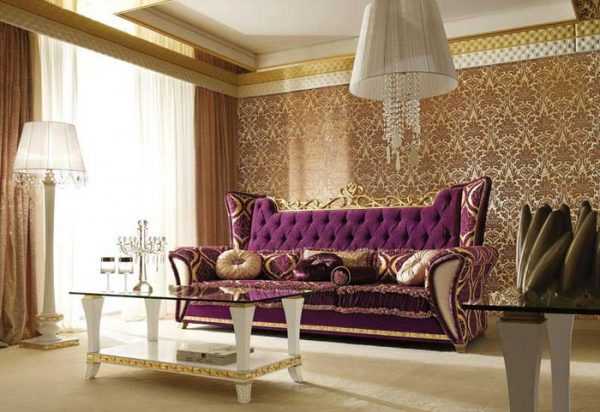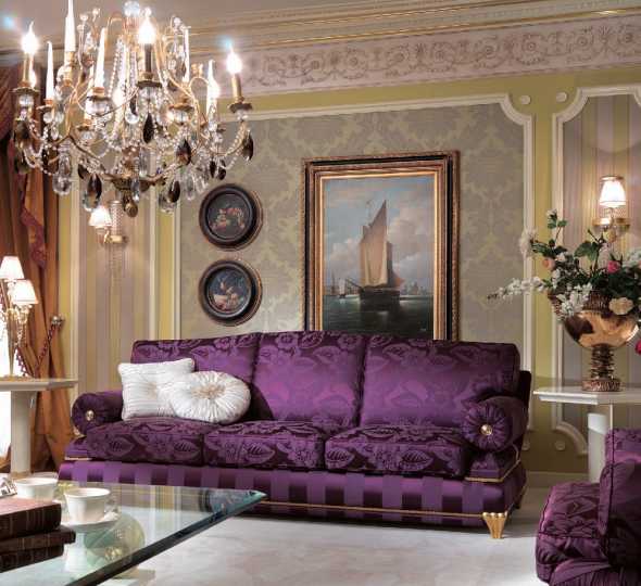 В классическом стиле лиловый диван будет выглядеть изыскано и роскошно в сочетании с бежевыми обоями и лавандовыми портьерами на окнах. Создавая такой дизайн, присмотритесь к бархатной обивке дивана с изящными элементами декора.