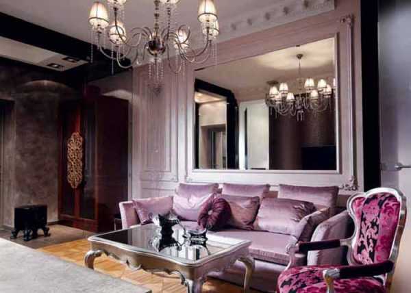 - Классика – мебель в этом интерьере потребуется дорогая, из натурального дерева, но может относиться к разным эпохам. Предметы обстановки должны иметь симметричный, правильный облик, строгих форм, обильно украшенные резьбой с массивными очертаниями. Возле лилового дивана из бархатной обивки располагают козетки, кресла, пуфы бежевых и лавандовых оттенков. В качестве декора используют зеркала в позолоченных рамах, скульптуры, карандашные наброски классической живописи. Угловой, пристенный или островной камин из мозаичной плитки будет настоящим украшением в интерьере гостиной.