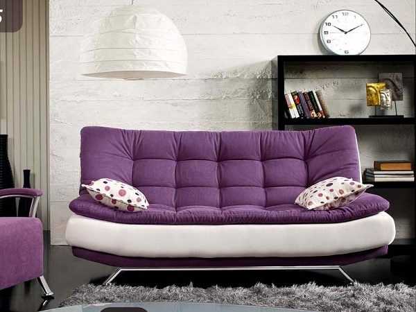 В минимализме может встречаться диван любого оттенка фиолетового цвета, потому что чаще всего именно на нем замыкают весь интерьер. Стены в таких комнатах обычно имеют простое однотонное оформление, поэтому яркий диван становится центром всей композиции. Важно и современное требование — он также должен иметь самую простую форму, поэтому в небольших комнатах можно встретить фиолетовые диваны-кровати, которые не просто красиво смотрятся в интерьере, но также позволяют организовать дополнительное спальное место. Когда хозяева жилища придерживаются принципа минимального использования предметов в интерьере, такая конструкция станет настоящим спасением.