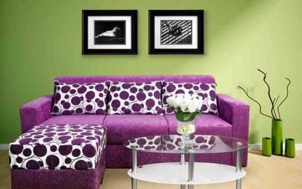 - Фиолетовый и зеленый. Такое сочетание подойдет более смелым натурам, однако его природная самобытность не раздражает глаз, а, наоборот, делает интерьер законченным и лаконичным. Зеленая гостиная с фиолетовым диваном будет уголком спокойствия и созерцания.