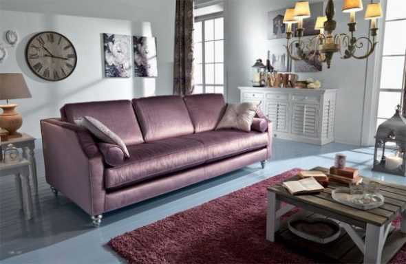 Крестьянский стиль прованс получится утонченным и мечтательным, если его центром окажется нежно – сиреневый или лавандовый диван.