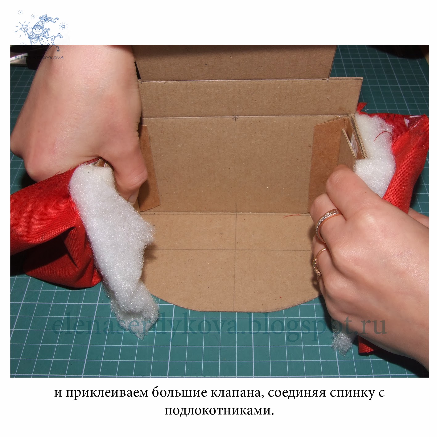 - Из небольших коробок можно сделать стулья, а затем покрыть небольшим количеством ватина и ткани.