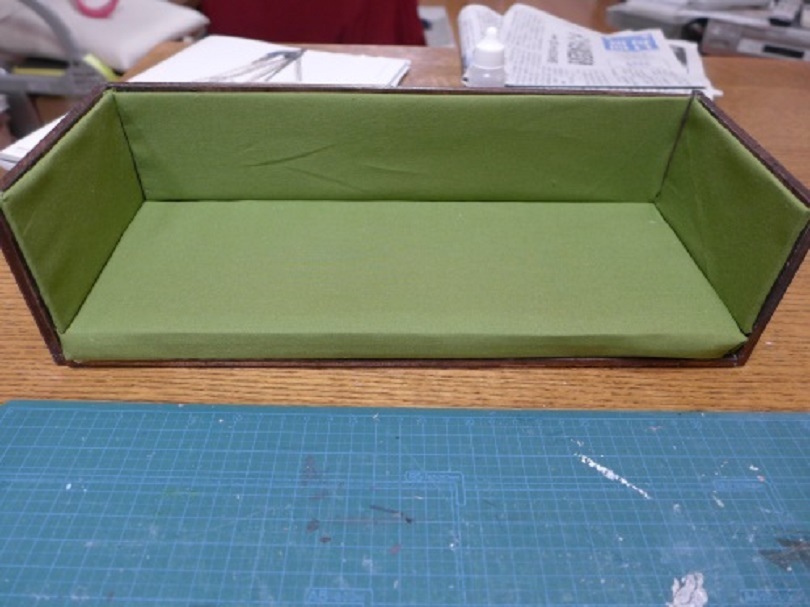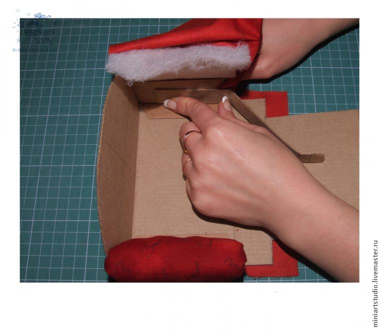 4. Когда картон высохнет от клея, следующим этапом производится отделка тканью. Каждая часть обтягивается материей отдельно, поэтому нужно сделать замеры. Ткань клеится к картону, пристегивается степлером. Иногда пришивается ниткой, но этот процесс сложный и долгий. Все швы должны быть закрыты вовнутрь, чтобы ребенок не мог разорвать обивку.