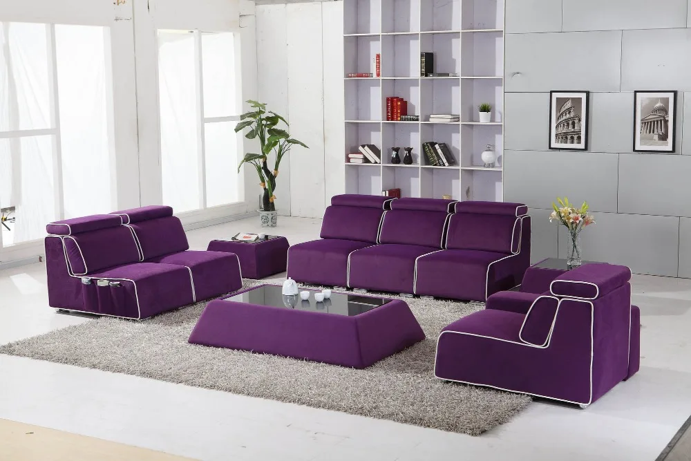 Современный дизайн гостиной с фиолетовым диваном