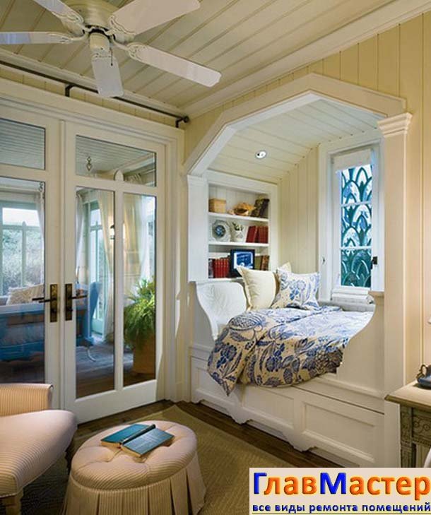 Использование глубокой ниши с почти углублением кровати в длину или ширину. Для любителей уединенного места для сна, которое можно отгородить шторой и даже дверцей, будет отличным решением создание глубокой ниши для кровати.