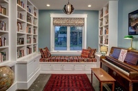Ниша необычной формы, выходящая в окно, создает идеальное, хорошо освещенное место у окна в этой библиотеке.