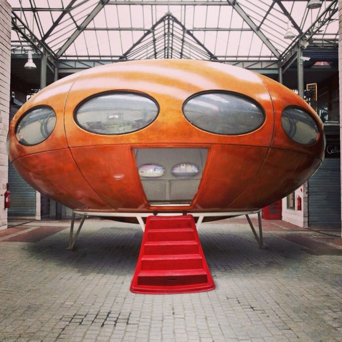 » Описанный как дом для отдыха 1970-х годов, этот дом в форме летающей тарелки, названный «Футуро», состоит из 16 предварительно формованных сегментов стекловолокна. Он был спроектирован финским архитектором Матти Сууроненом. лицензии Oy Polykem из Хельсинки ланкаширской фирмой (Waterside Plastics Ltd, Тодморден) и описывается как дом отдыха сегодняшнего и завтрашнего дня.0026 »