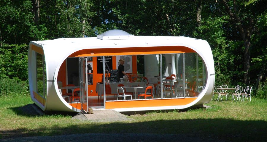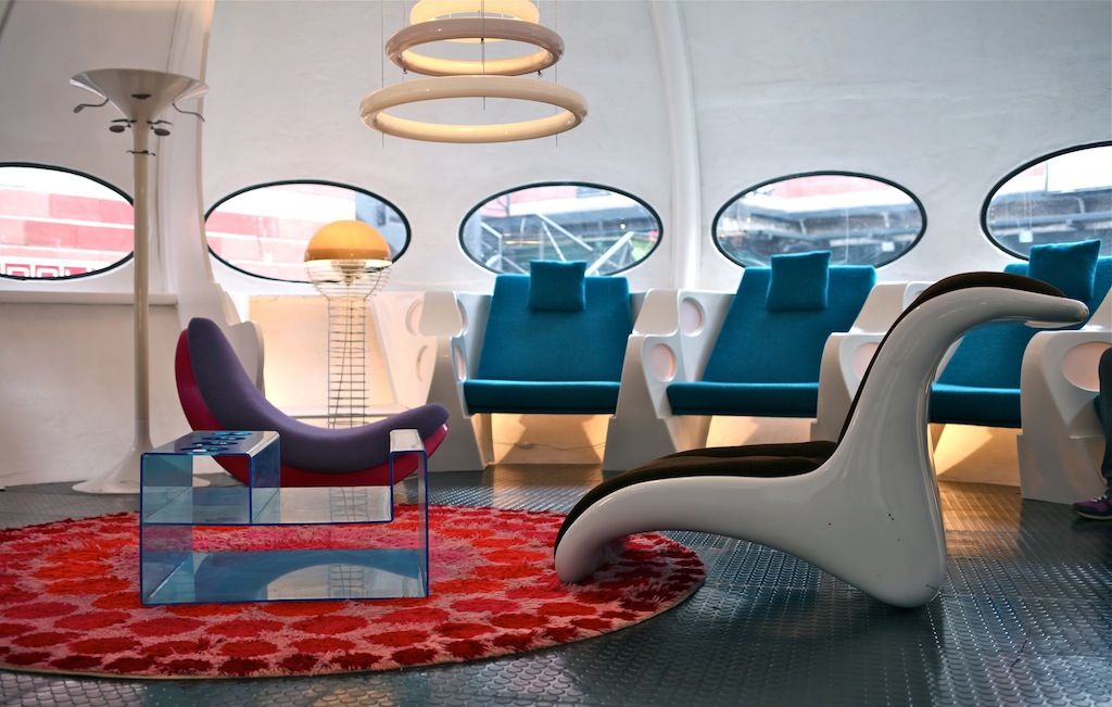 ИнтерьерПопулярность к модели пришла на выставке Finnfocus в Лондоне, именно тогда дом назвали Futuro. Патенты на его изготовление и дистрибуцию продали в несколько стран, и летающие тарелки стали приземляться на разных континентах. Для них позже создали типовую мебель, и владельцам больше вообще ни о чем не нужно было волноваться.