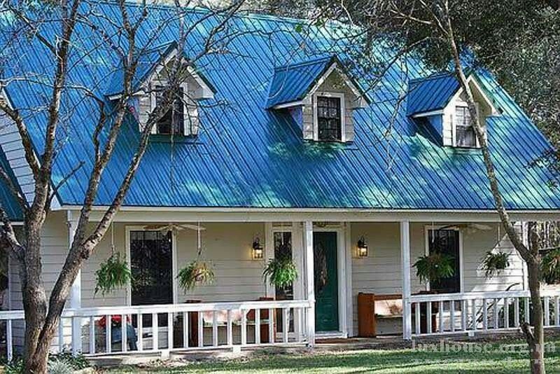 - Как видно на фото очень гармоничная композиция получается при использовании голубого цвета в сочетании с коричневой крышей и аналогичными по оттенку элементами водосточной системы.